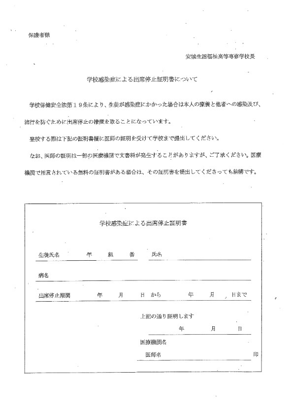 2025年12月05日(金) NEW 学校感染症による出席停止証明書について 学校封建安全法第19条により、生徒が感染症にかかった場合は、 本人の療養と他者への感染及び流行を防ぐために出席停止の措置を 取る事になっています。 登校する際は、下記の証明書欄に医師の証明を受けて学校まで提出してください。 なお、医師の証明は一部の医療機関で文章料が発生することがありますが、ご了承ください。 医療機関で用意されている無料の証明書がある場合は、その証明書を提出してくださっても結構です。
