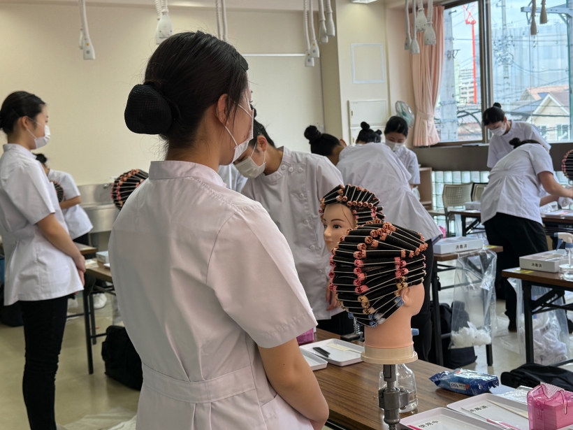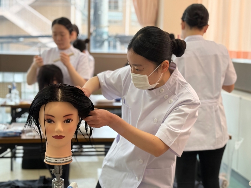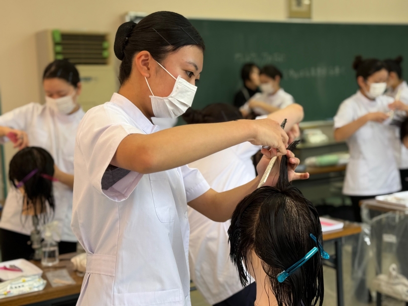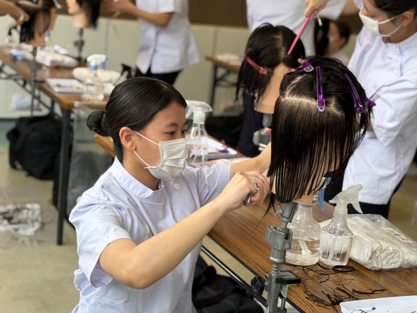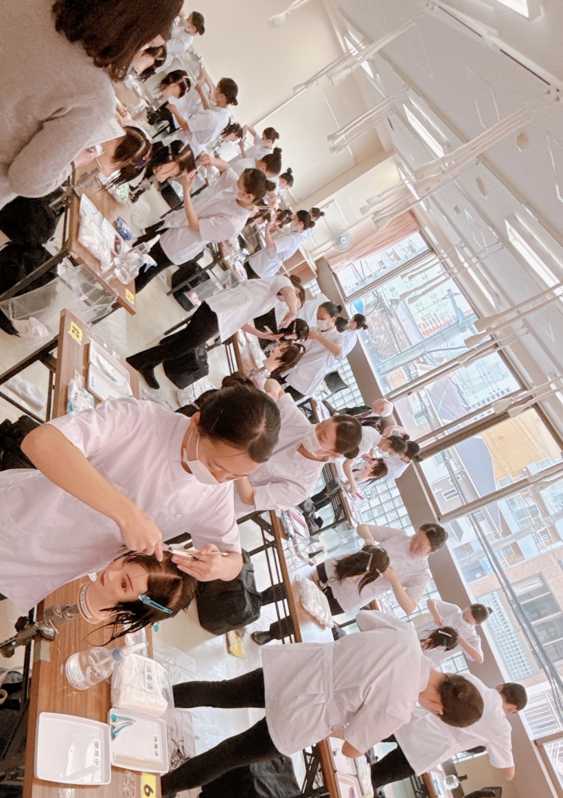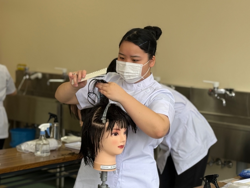 美容師国家試験に向けて、本番を見据えた練習が行われています。全員が一分一秒を大切にしながらスピードと技術の最終調整で全集中する時間です。