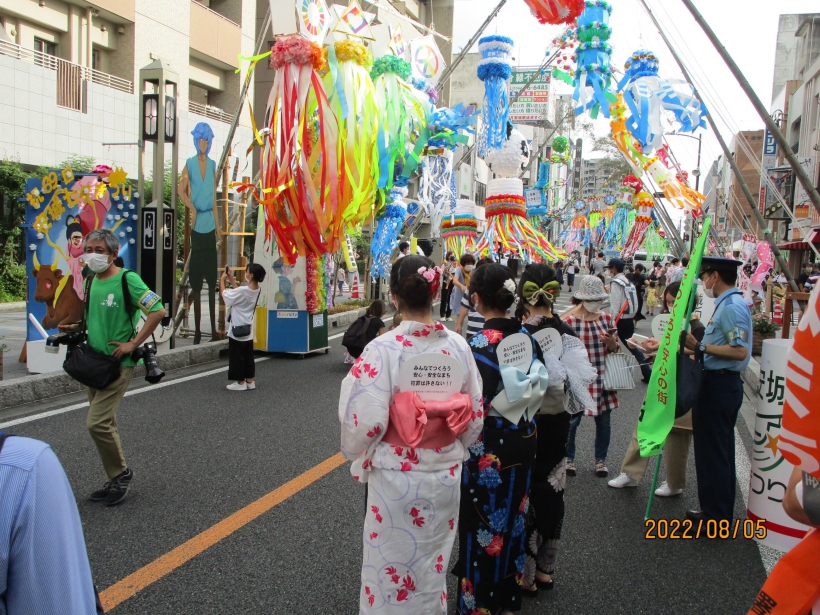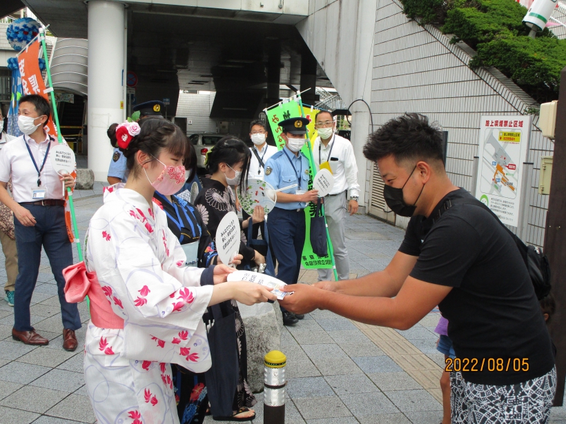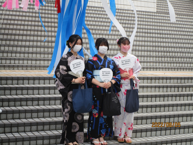 2022年08月05日(金) 防犯キャンペーン with安城警察署 in安城七夕まつり 今年は安城七夕まつりが何年ぶりかで開催! その七夕まつりに合わせて、安城警察署と協働で防犯キャンペーンを実施致しました。 この日はお祭りですので、生徒たちも浴衣に着替えて啓発呼びかけパワーアップ! 七夕まつりの来場者に対して、 「防犯うちわ」や「啓発チラシ」を手渡しながら、 特殊詐欺や自転車盗難等への被害防止を呼びかけました。 本校では、SDGs「平和と公正をすべての人に」を安城警察署と積極的に取り組んでおります。 是非、街で出会った際には、温かいお声掛け、宜しくお願い致します!!