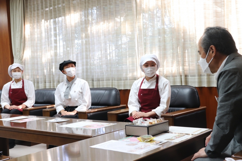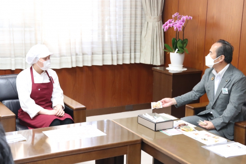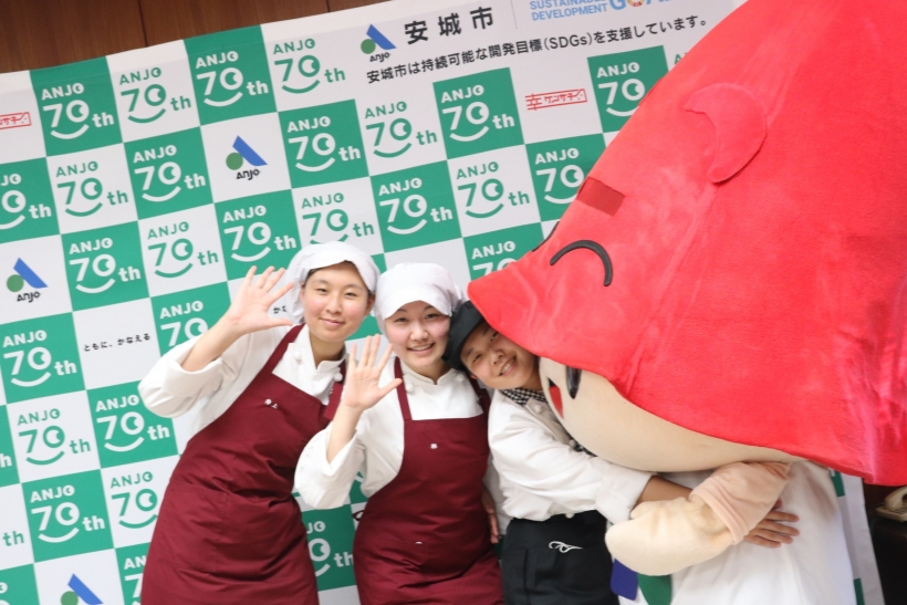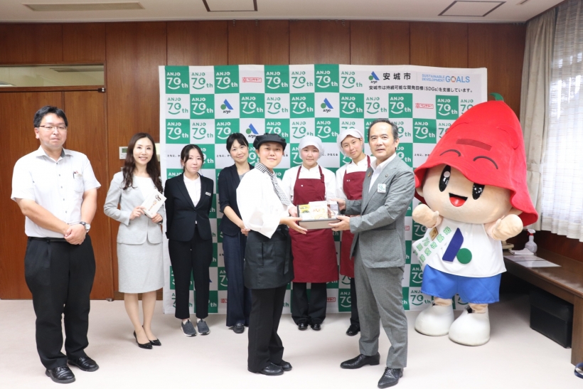 2022年09月13日(火) 【安城市:表敬訪問】ふるさと納税出品報告! 安城市ふるさと納税に出品をさせて頂いている事を受けて、 市長へ表敬訪問を行い、返礼品である「パティシエの卵:お菓子の詰め合わせBOX」 のご報告をさせて頂きました! コロナ渦と言う事もあり、市長に試食は叶いませんでしたが、 ご家族でおうちに帰ってから食べて頂けるとの事。 そして、安城市マスコットキャラクターのサルビーも激励に来てくれました!! 今回の返礼品である作品は、パティシエ専攻の生徒及び教員によるオリジナル商品です。 是非、安城市以外のみなさん、ご賞味ください♪